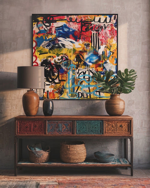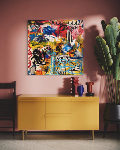 36x36 in. abstract painting, acrylic, collage, spray paint, pencil on gallery style fine art canvas.