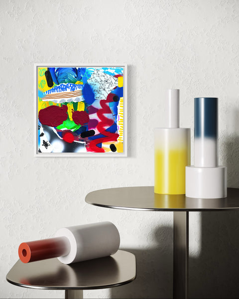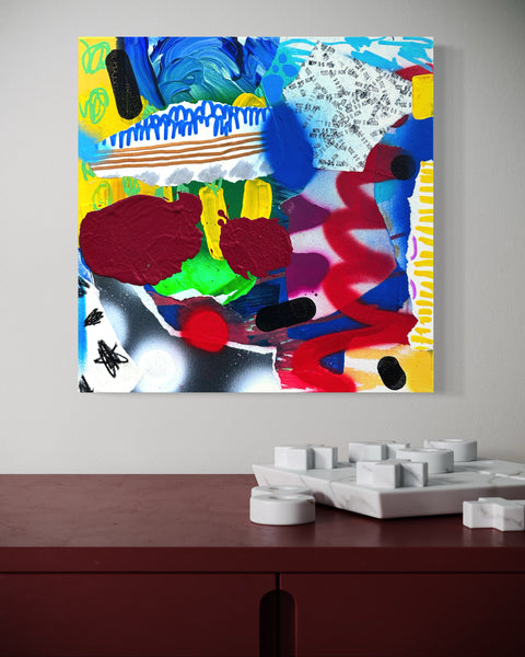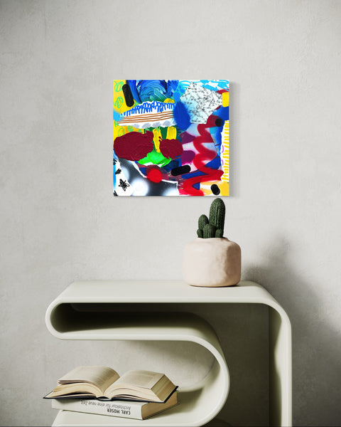 12x12 in. abstract painting, acrylic, collage, spray paint, pencil on gallery style fine art canvas.