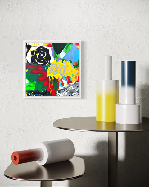 12x12 in. abstract painting, acrylic, collage, spray paint, pencil on gallery style fine art canvas.