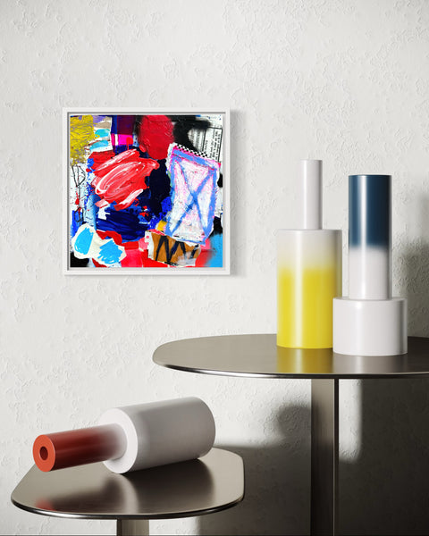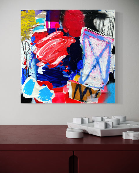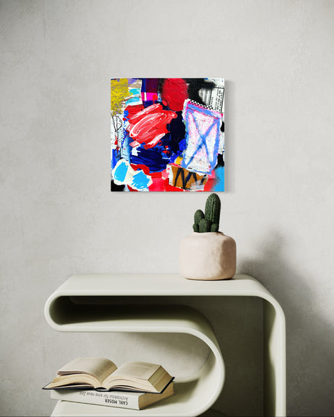 12x12 in. abstract painting, acrylic, collage, spray paint, pencil on gallery style fine art canvas.