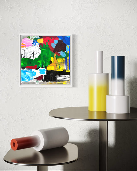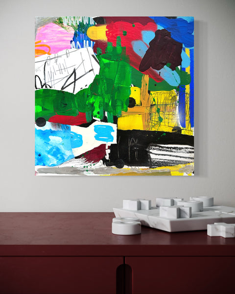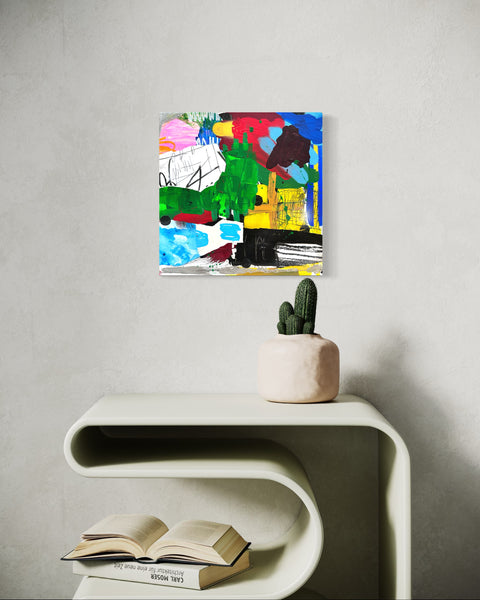 12x12 in. abstract painting, acrylic, collage, spray paint, pencil on gallery style fine art canvas.
