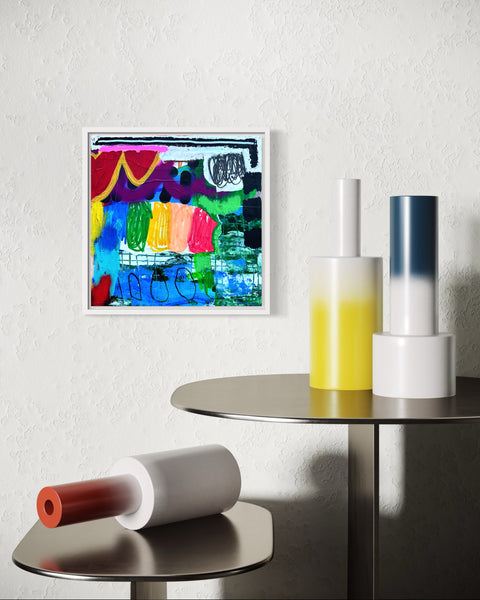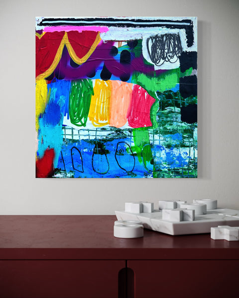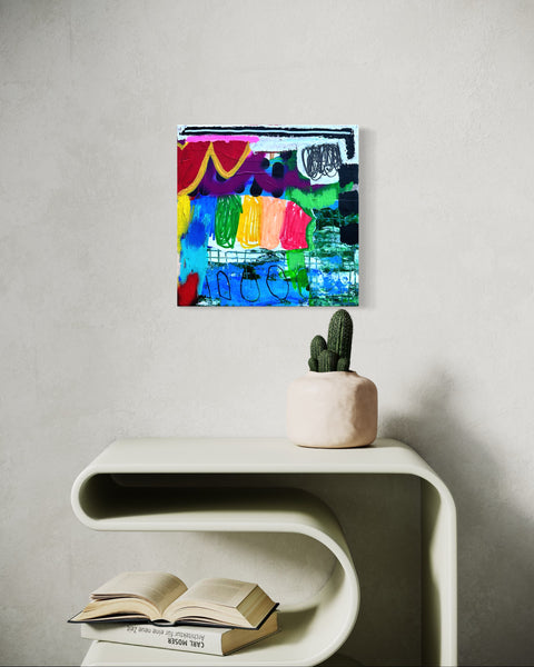 12x12 in. abstract painting, acrylic, collage, spray paint, pencil on gallery style fine art canvas.