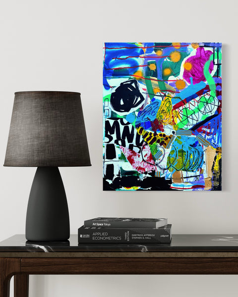 16x20 in. gallery style canvas.  abstract painting, acrylic, collage, spray paint, pencil on gallery style fine art canvas.