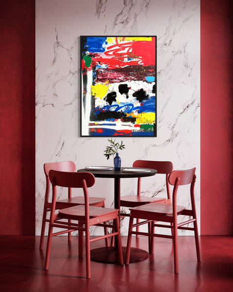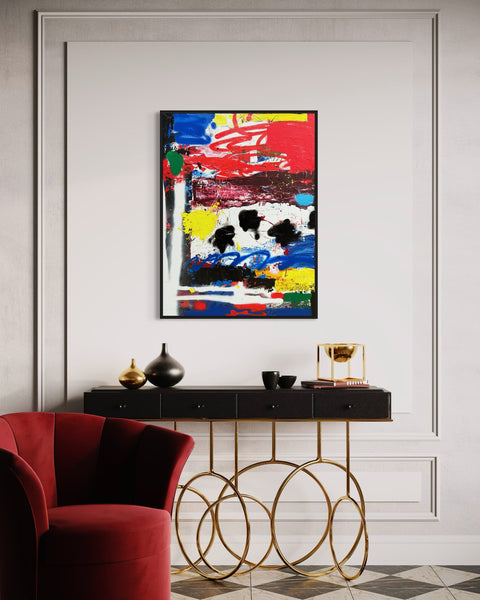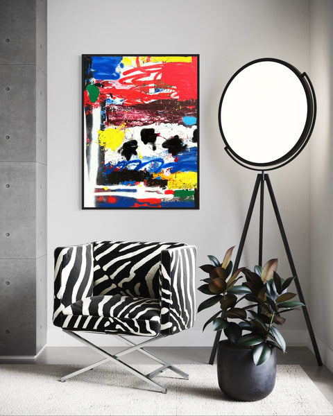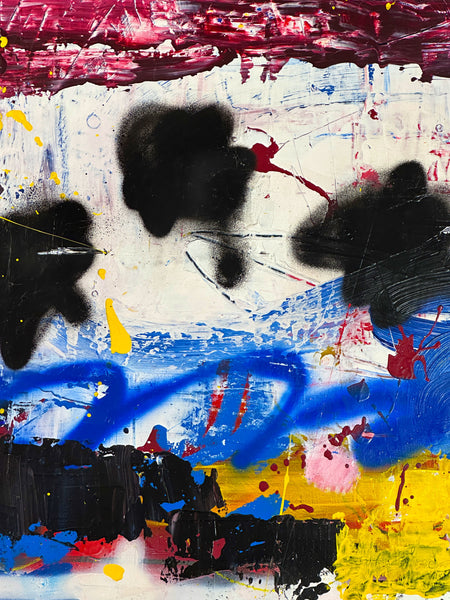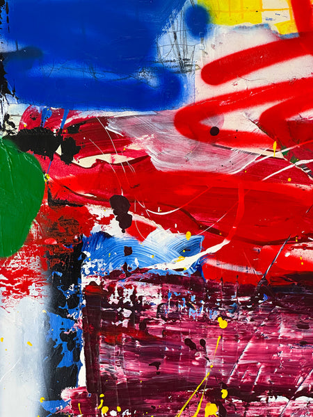 30x40 in. abstract painting, acrylic, collage, spray paint, pencil on gallery style fine art canvas.
