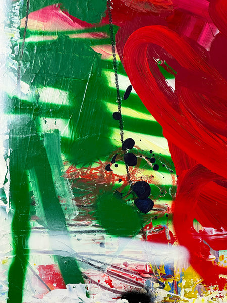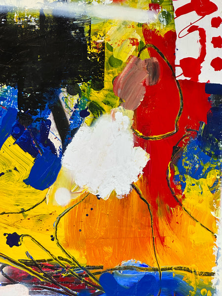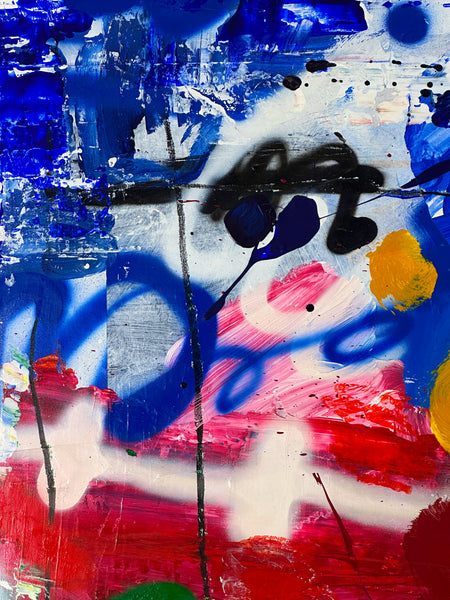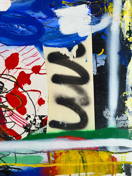 36x36 in. abstract painting, acrylic, collage, spray paint, pencil on gallery style fine art canvas.